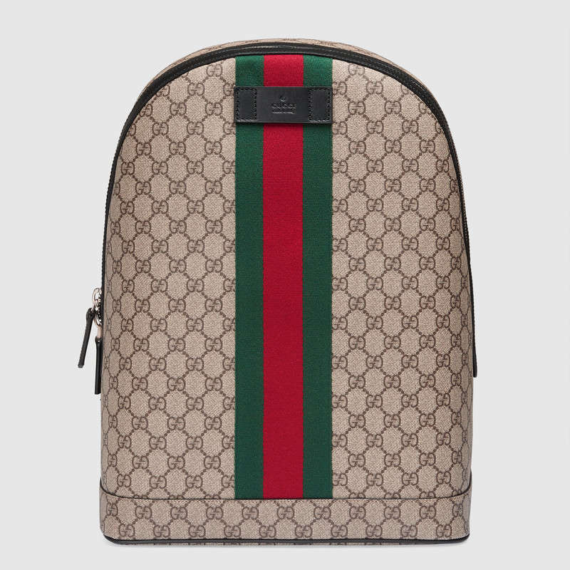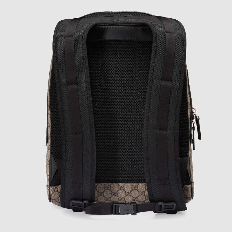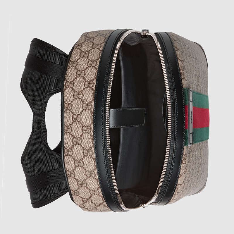 The Web is found along the front of a GG Supreme canvas backpack, trimmed with black leather. This style is equipped with mesh-lined shoulder straps and interior pockets for smartphone and tablet.