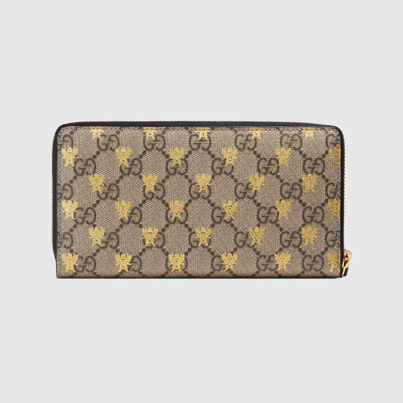 The GG Supreme wallet is enriched with allover gold printed bees鈥攁 historical symbol from the House archives, first introduced in the 1970s.