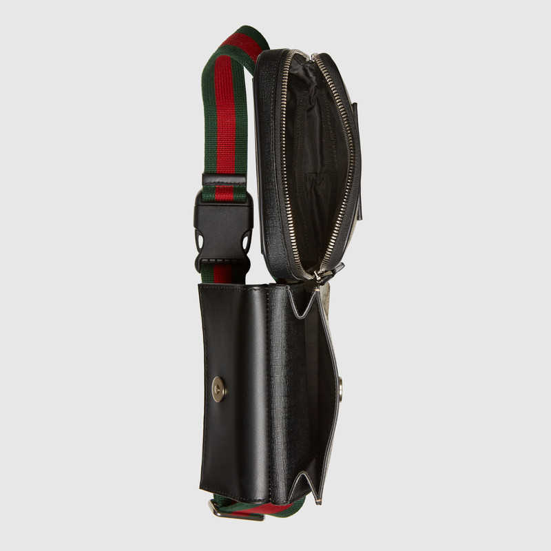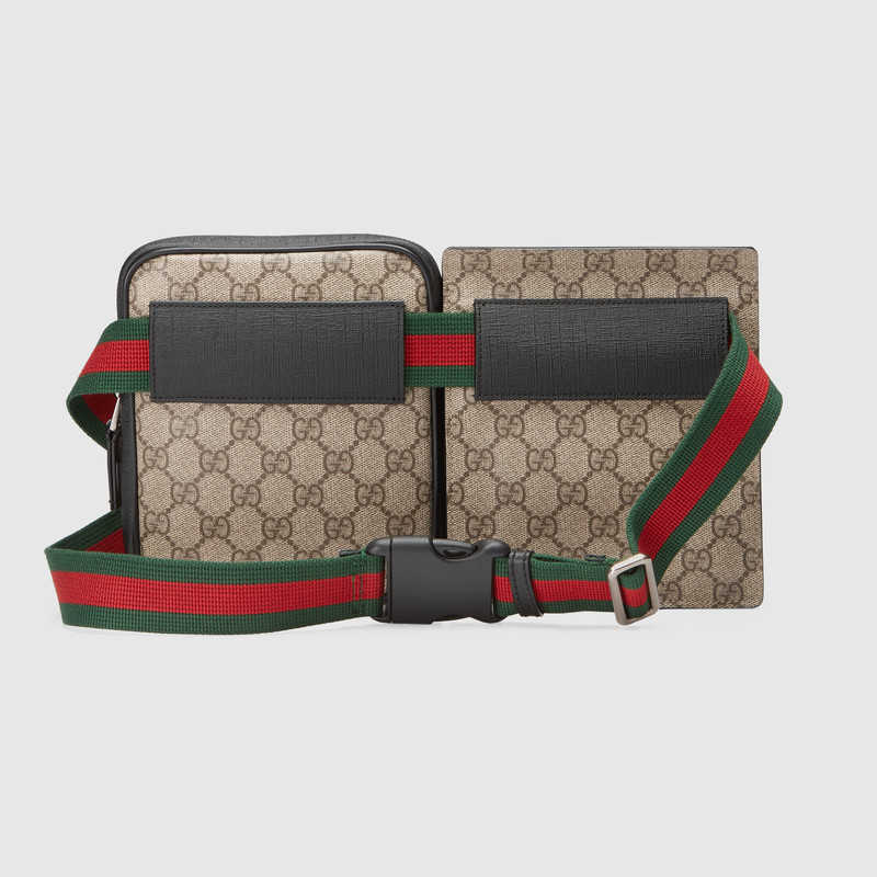 A two-pouch belt bag in GG Supreme canvas with black leather trims. The Web waistband secures with a buckle closure.
