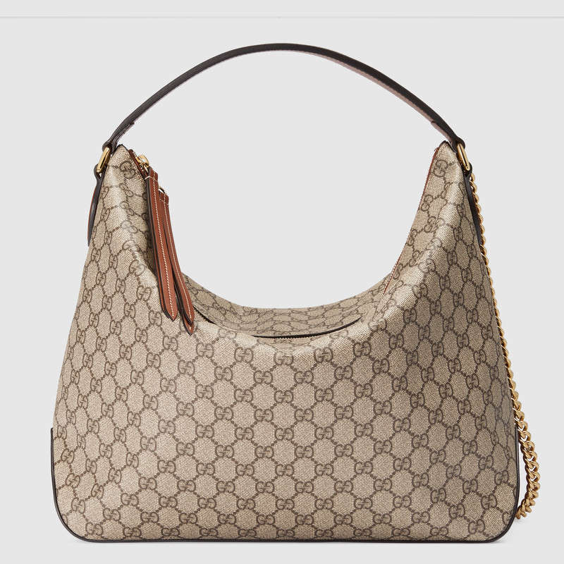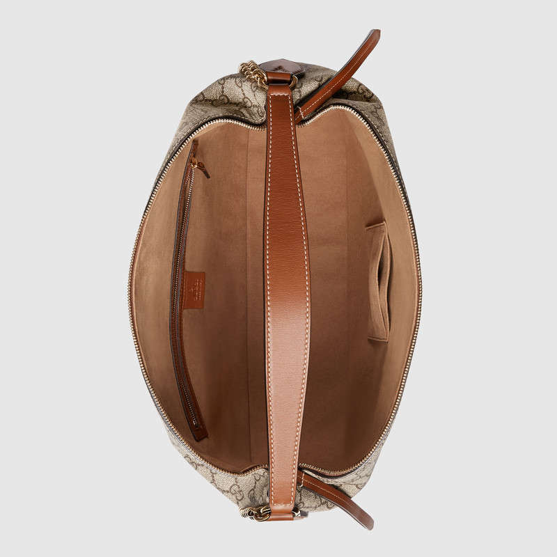 A large hobo with an attached chain shoulder strap and a leather top handle. The handles have been hand-stitched with a padded base. The GG Supreme canvas is crafted from a coated microfiber fabric with the GG motif.