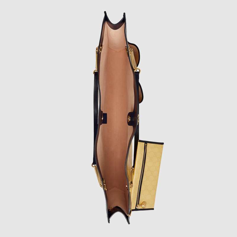 The tiger head defines this collection of bags, finished with colored enamel and sparkling crystals inspired by a vintage piece from legendary fashion and jewelry designer Hattie Carnegie's 1940s archives. Presented in the Cruise 2019 collection, the maxi tote is crafted from patent GG canvas with blue and red Web, completed with two exterior pockets.
