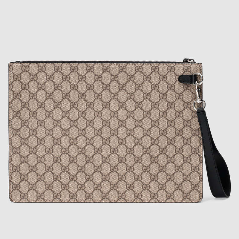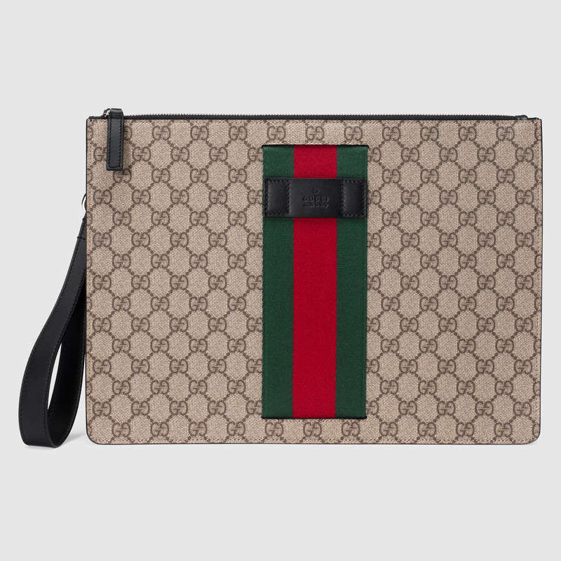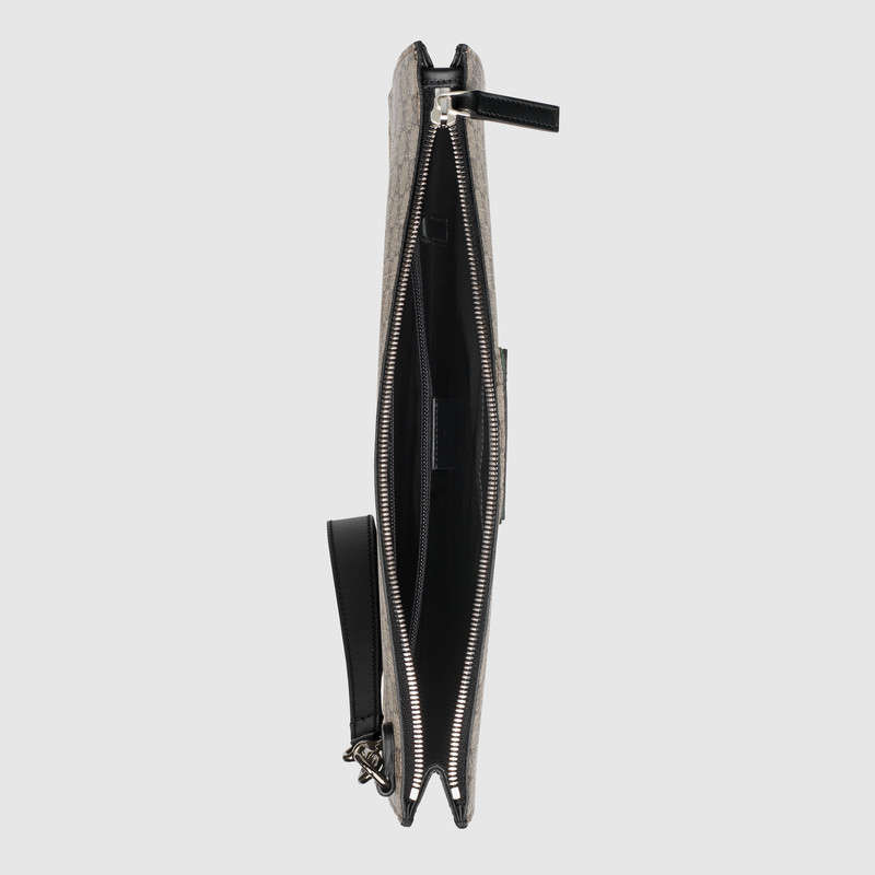 The Web is found along the front of a slim zipper pouch in GG Supreme canvas, trimmed with leather.