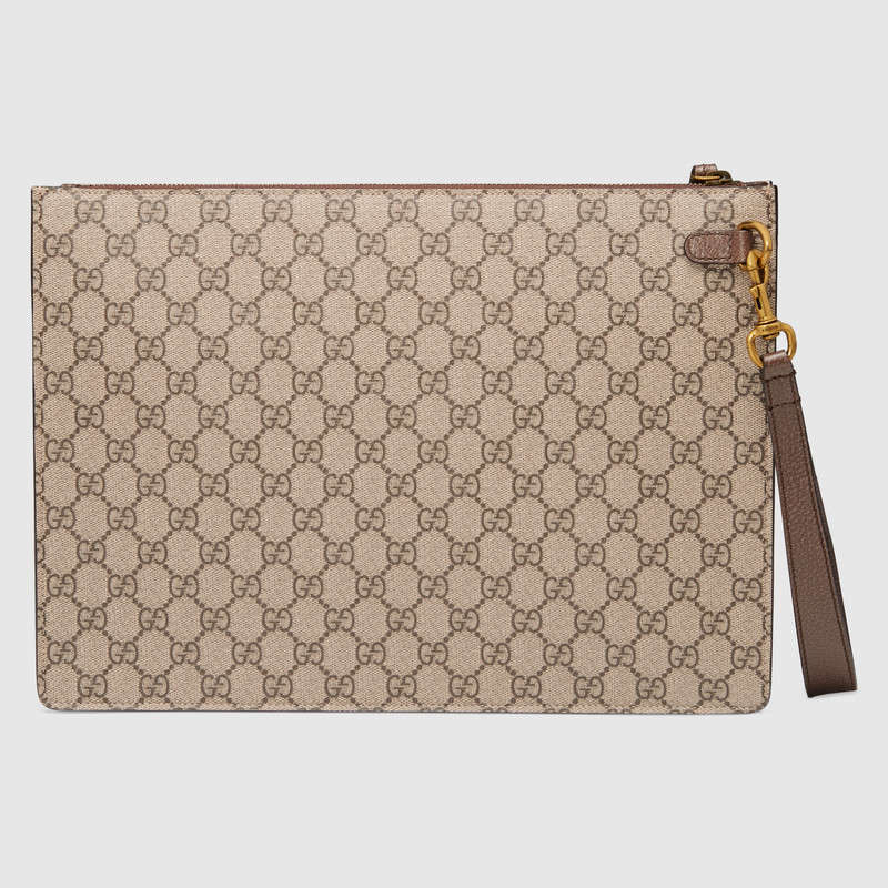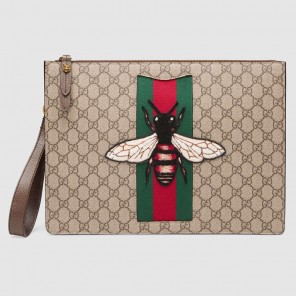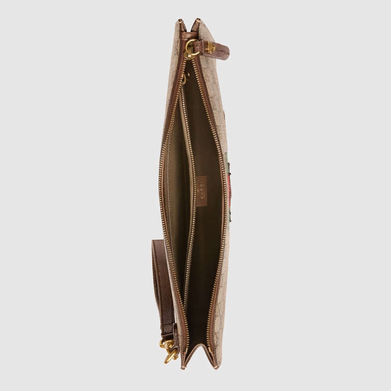 The Gucci bee-a historical Gucci code taken from the '70s archives-is reinterpreted for Fall Winter as a new applique. Embroidered by hand by specialized artisans in Italy, each applique is created from wool-blend yarns and hand-applied to a slim zipper pouch in GG Supreme canvas with Web. Due to this careful and individualized process, each embroidery will vary from piece to piece.