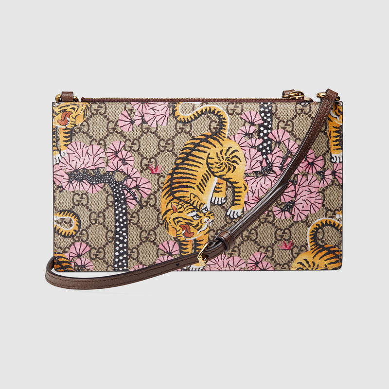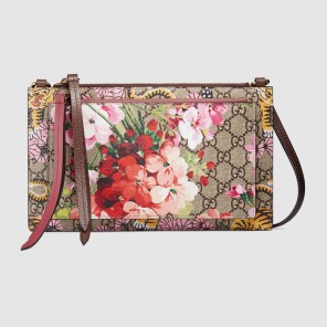 A shoulder bag in GG Supreme canvas featuring two distinctive prints of the collection. The shoulder bag is printed with the Gucci Bengal print and has a detachable pouch with the Blooms print, which is meant to be interchanged with other printed pouches in the collection.