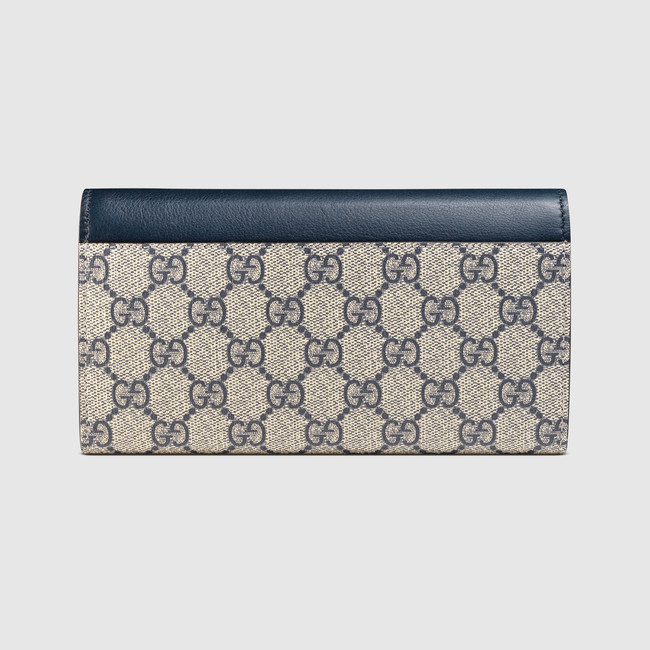 A GG Supreme canvas continental wallet with a snap closure and a blue leather flap and white leather interior.