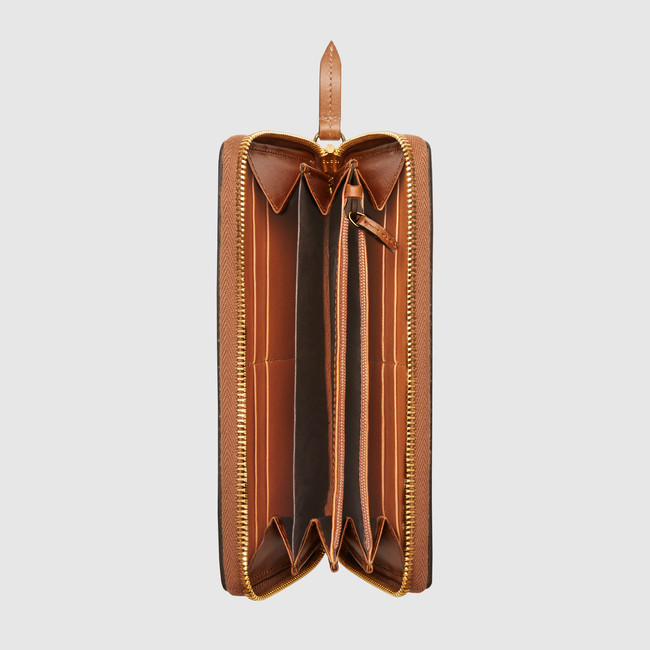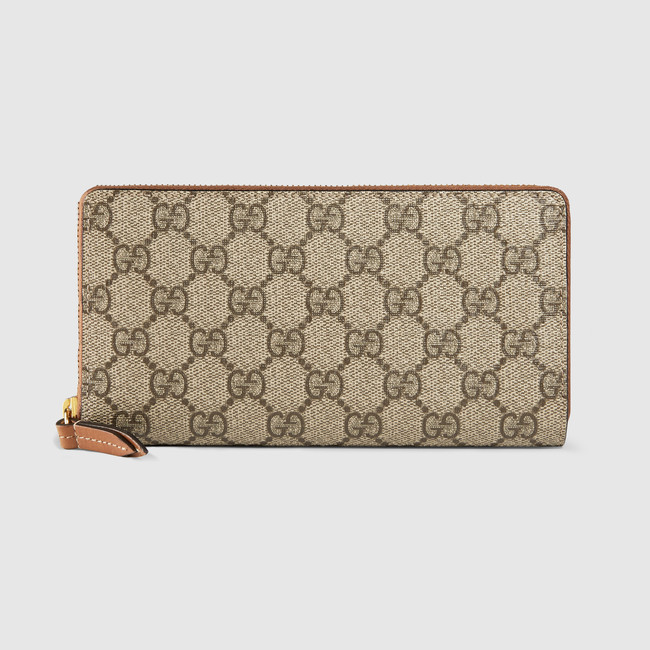 A GG Supreme canvas zip around wallet with a brown leather zipper pull detail.