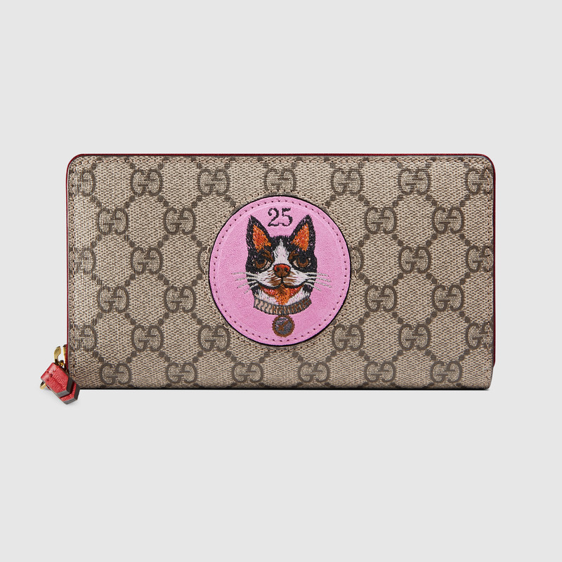 The GG Supreme wallet features a suede patch embroidered with the image of Bosco, the Boston terrier. Depictions of the Creative Director's pets appear throughout the Cruise 2018 collection, connected to the Chinese calendar's year of the dog.