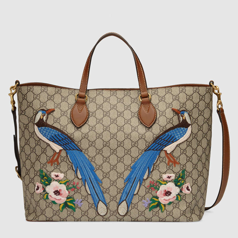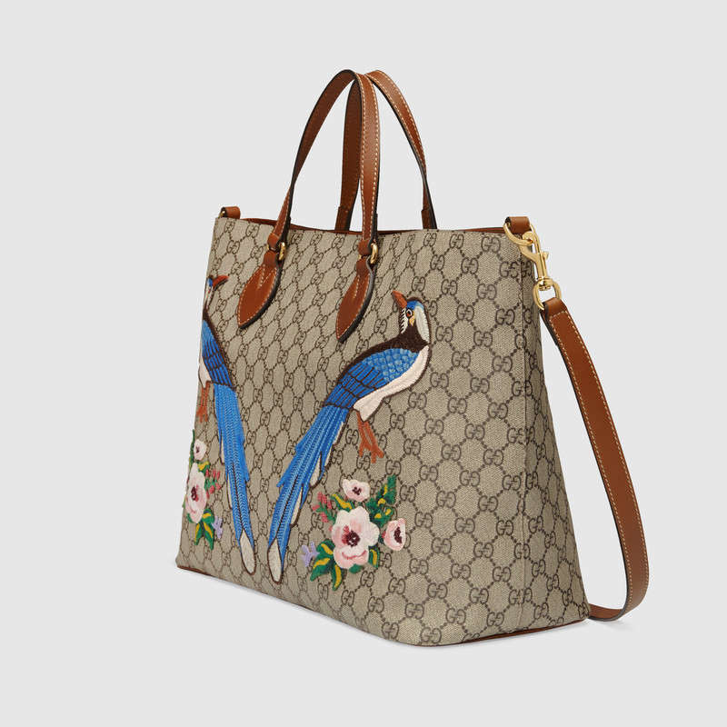 Part of the Gucci Garden Souvenir Collection, this tote is embellished with hand-finished embroidered peacock and floral appliques. This special design was created exclusively for Gucci.com. Made in soft GG Supreme, a softer version of GG Supreme canvas, crafted from a coated microfiber fabric with the GG motif.