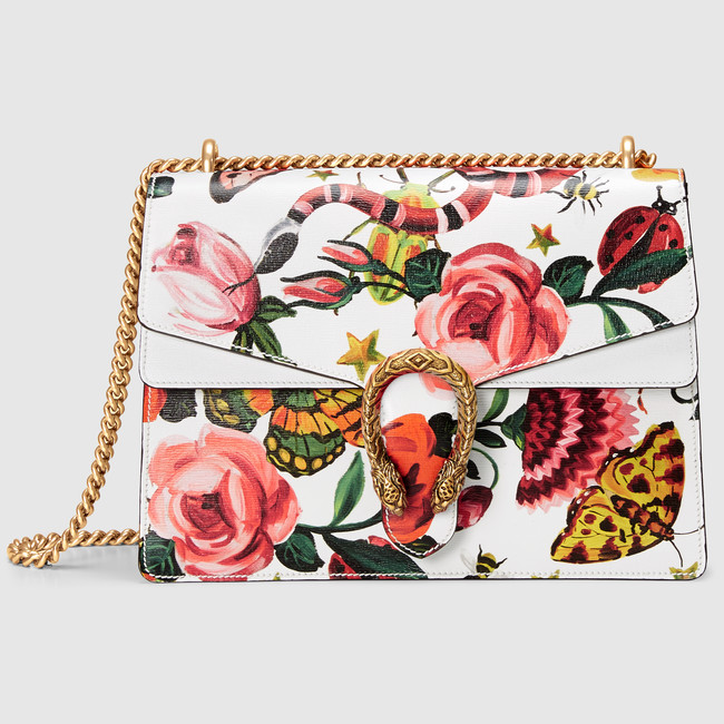 The Dionysus shoulder bag in leather is introduced with the Gucci Garden print, available exclusively on Gucci.com. A beautiful compilation of floral and animal motifs from the world of Alessandro Michele, diverse flowers intertwines with butterflies, ladybugs, birds, bees, colored beetles and the kingsnake, creating a veritable Gucci garden. The print is designed to resemble an oil painting with visible brushstrokes on the flower petals, the wings of butterflies and the leaves.