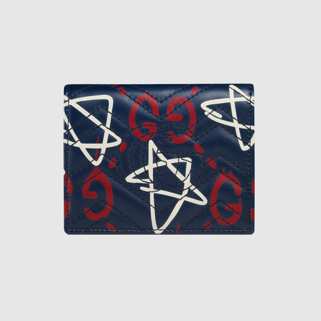 The artist GucciGhost, aka Trevor Andrew, was invited by Alessandro Michele to collaborate on a special project that incorporates GucciGhosts鈥檚 street art into Alessandro鈥檚 designs. The final product is a mix of two cultures-a juxtaposition of the past and the present. This card case was designed by Alessandro and customized by GucciGhost.