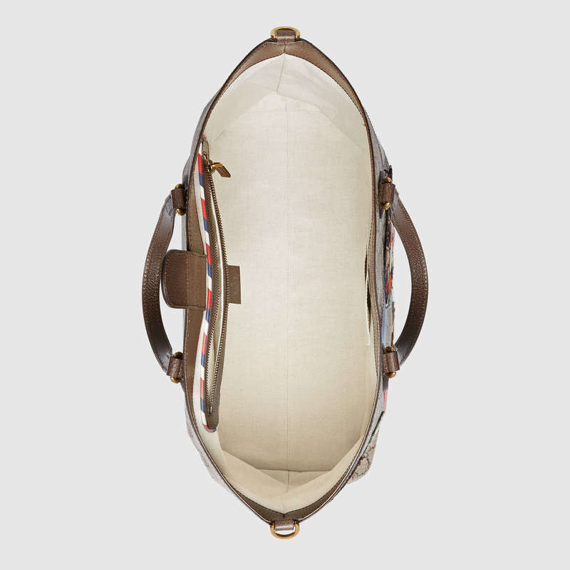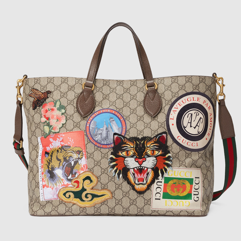 Travel continues to be a source of inspiration for Alessandro Michele. A collection of bags in the GG motif is enriched with a blend of contemporary embroideries and vintage inspired details, including airmail trims and a Gucci vintage logo from the archives. The appliques are individually embroidered and then skillfully hand-applied to each piece by specialized artisans. This process ensures that no two items will be alike, giving each a one-of-a-kind appearance.