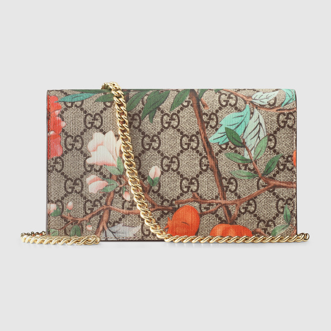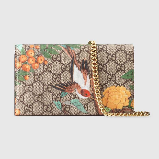 A mini chain bag made in our GG supreme tian canvas. Our new Gucci Tian print features a contemporary floral motif inspired by Chinese landscapes depicted on 18th-century tapestries and screens. The floral pattern is made up of flowers, insects and birds-including dragonflies, butterflies and hummingbirds. The plants and creatures are represented through light and quick brushstroke-style graphics, with a three-dimensional effect printed on our GG Supreme canvas.