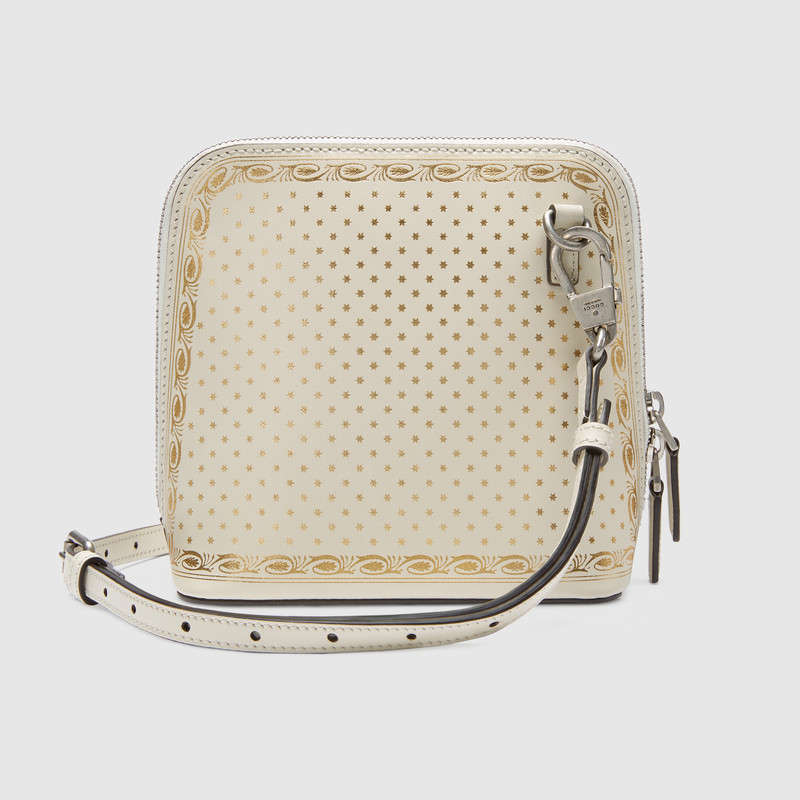 A culmination of various inspirations and nostalgic references, the Spring Summer 2018 collection pays homage to eighties video gaming culture, reintroducing the Guccy print in a graphic font that draws inspiration from the SEGA logo鈥攁 fixture in the colorful arcades and coin-op game rooms of the time. The emblem is combined with a stars and frame motif in a metallic gold print set against smooth leather.