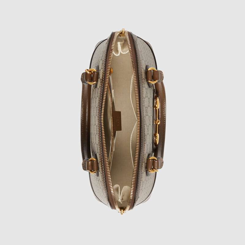 A new silhouette introduced to the Gucci Horsebit 1955 line for Spring Summer 2020, the medium size top handle has a domed shape with an optional leather shoulder strap, crafted from GG Supreme canvas and leather. The collection unifies details first introduced on the original bag that inspired the line from over six decades ago with a modern spirit, highlighting the Horsebit. Part of Gucci鈥檚 genetic code, the double ring and bar design has been established as one of the most distinctive elements among the House symbols borrowed from the equestrian world.