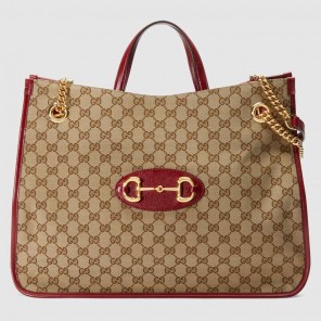 Designed with rounded edges and a soft shape, the Gucci Horsebit 1955 tote bag is made from GG Supreme canvas with white leather trim. The large double-handled silhouette has a chain shoulder strap that complements its modern spirit, finished with an organizational interior and magnetic snap closure. The collection unifies details first introduced on the original bag that inspired the line from over six decades ago with a modern spirit, highlighting the Horsebit. Part of Gucci鈥檚 genetic code, the double ring and bar design has been established as one of the most distinctive elements among the House symbols borrowed from the equestrian world.