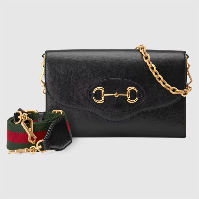 Embodying the notion of the versatility, the Gucci Horsebit 1955 is enriched with two detachable shoulder straps, one is crafted in emblematic green and red Web the other is in Gucci鈥檚 recognizable gold-toned chain design. The style is crafted from black leather and defined by the line's signature Horsebit hardware.