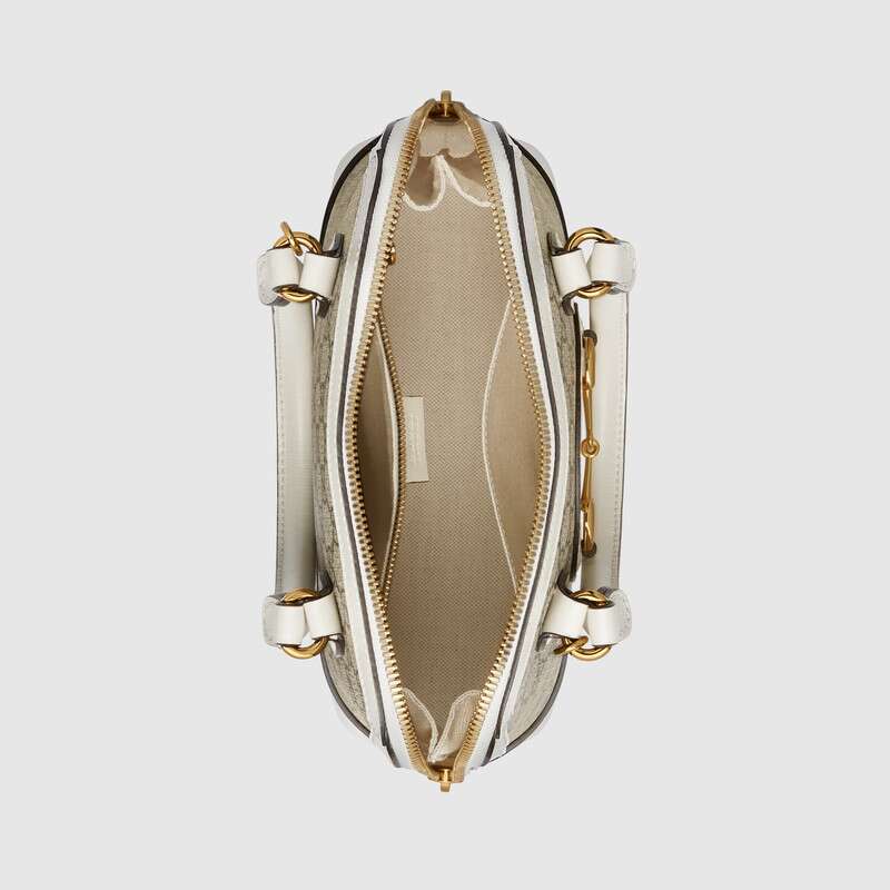 The Gucci Horsebit 1955 top handle has a domed shape with a detachable leather shoulder strap, crafted from GG Supreme canvas with white leather. The collection unifies details first introduced on the original bag that inspired the line from over six decades ago with a modern spirit, highlighting the Horsebit. Part of Gucci鈥檚 genetic code, the double ring and bar design has been established as one of the most distinctive elements among the House symbols borrowed from the equestrian world.
