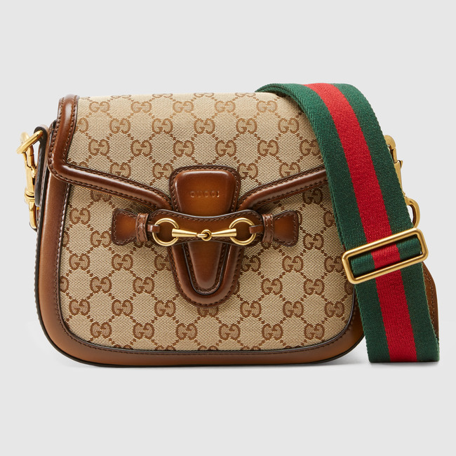 The Lady Web shoulder bag in our Original GG canvas with brown hand-stained leather trim and a web nylon shoulder strap.