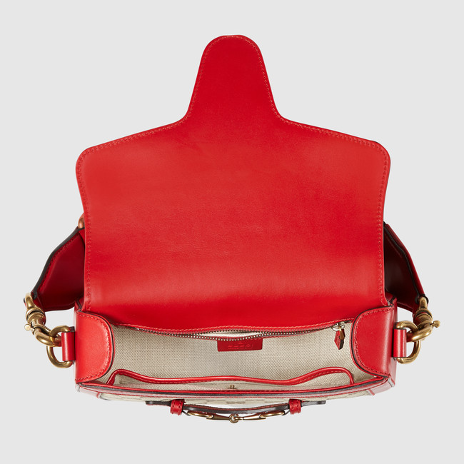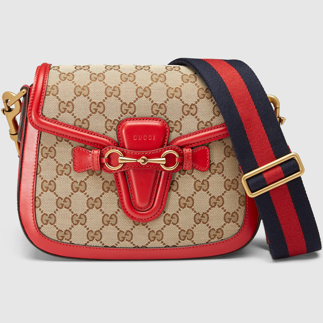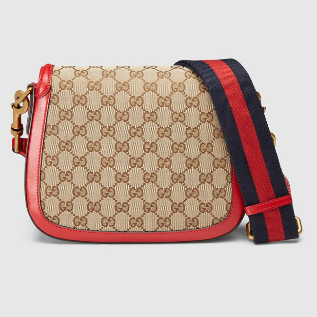 The Lady Web shoulder bag in our Original GG canvas with hibiscus red leather trim and a web nylon shoulder strap.