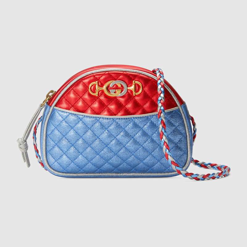 The Fall Winter 2018 collection portrays a dynamic clash of different elements and styles. In a color combination that is reminiscent of the classic Web, this mini bag is crafted from matelass茅 metallic leather and features a hybrid symbol merging two of the House's most distinctive codes: the Horsebit and the Interlocking G. The versatile accessory can be worn at different lengths, by tying one or more knots into the braided shoulder strap.