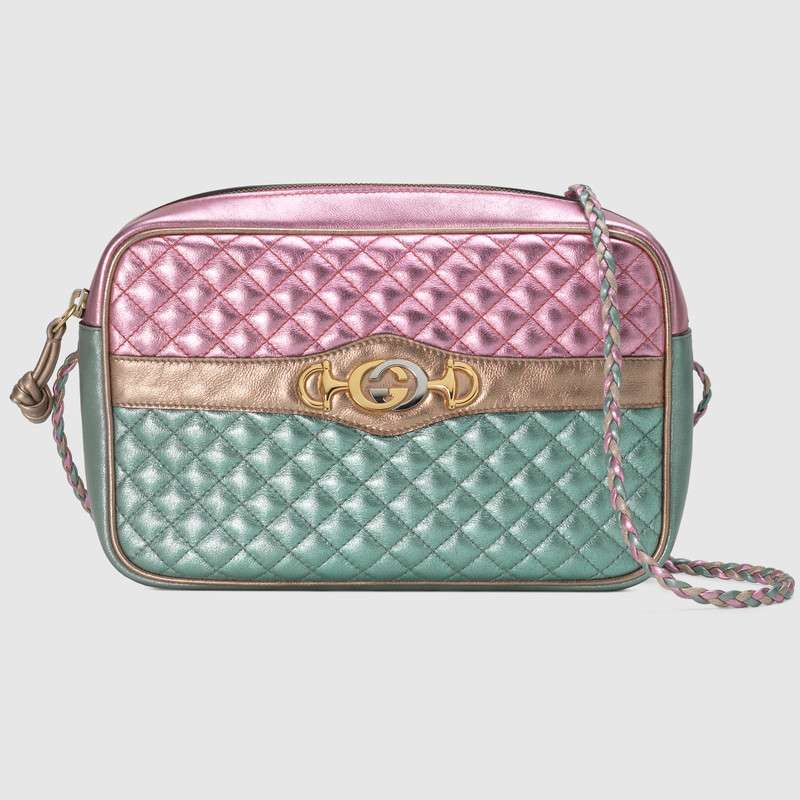 Imbued with a sportswear-inspired feel, the matelasse shoulder bag is made up of laminated leathers in the classic Web colors and features a new hybrid symbol, merging two of the House most distinctive codes: the Horsebit and the Interlocking G.