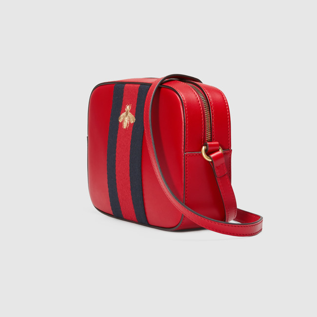 A small shoulder bag with a golden bee embroidery on our signature wool web. Made in our smooth, classic leather.
