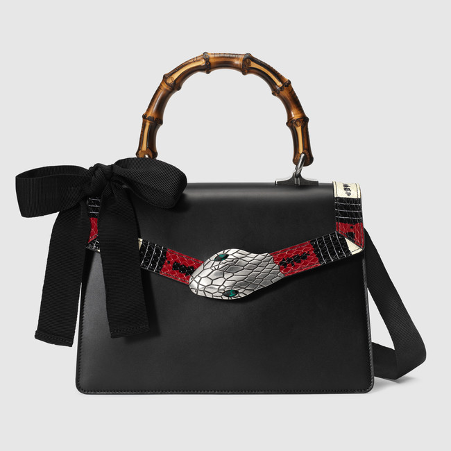 A small leather top handle bag with printed snakeskin detail along the flap and snake head closure. The snake is often associated with the image of Lilith, who in mythology is thought to have been the first wife of Adam and later, a demon. The textured snake head has crystal stones set in the eyes. The bag is further enhanced with a bamboo top handle and black grosgrain bow detail. Made in smooth leather.