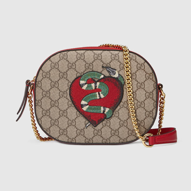 A special limited edition chain strap bag, featuring red leather trims and embroideries on GG Supreme. The appliques feature a kingsnake and heart and flowers embroideries.