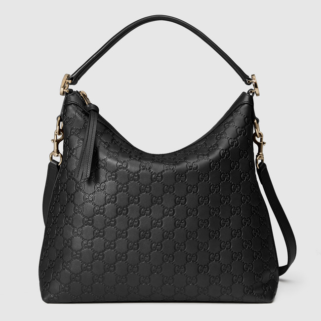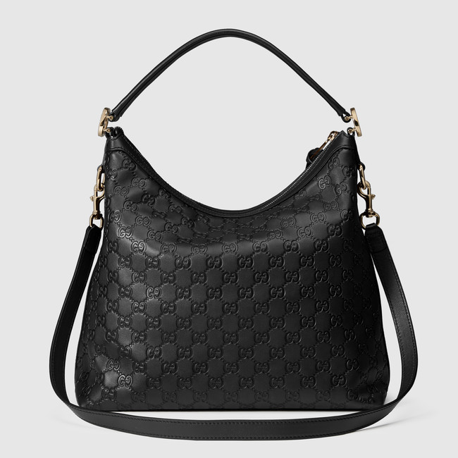Interlocking G details decorate the shoulder strap of this Miss GG hobo, plus a leather zipper pull and detachable shoulder strap. Made in our soft leather, heat-embossed with the GG logo.