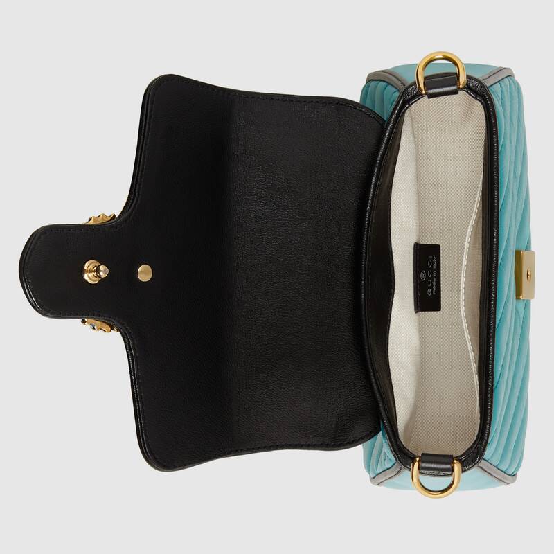 Soft shades appear throughout the latest collections, adding a whimsical feel. The GG Marmont bag is presented in diagonal matelass茅 quilted leather in soft shades of butter and blue. The mini top handle's distinct softly structured shape is outlined in black piping, highlighting its flap closure.