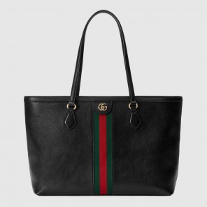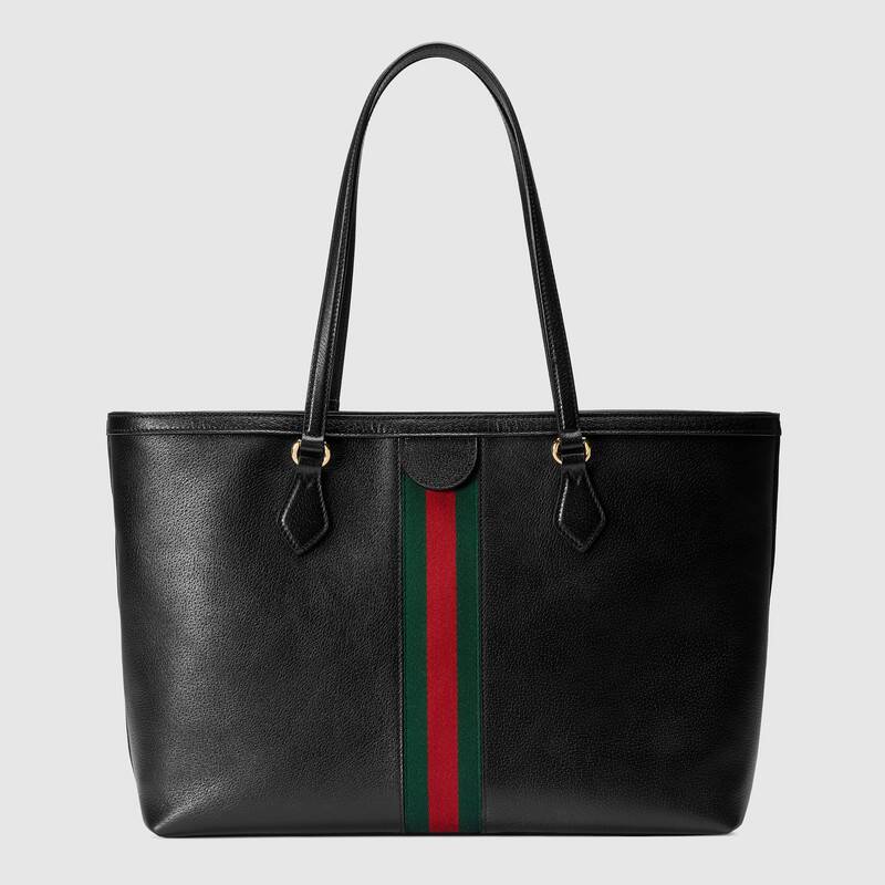 Enriched with vintage details, the world of Ophidia expands with the introduction of a black leather tote. With a softly structured silhouette, the bag pairs two archival details as a tribute to the origins of the House. The Double G is a reference to Guccio Gucci's monogram while the green and red Web stripe is a celebration of the brand's equestrian roots.
