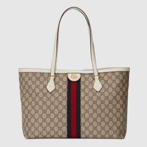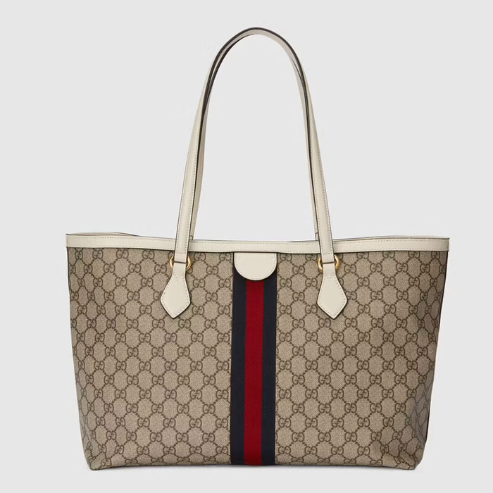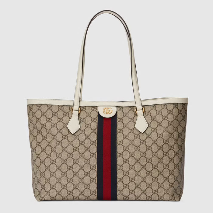 A classic combination of the House's most defining codes鈥攖he GG motif and Web stripe鈥攖he world of Ophidia continues to evolve, incorporating new shapes and silhouettes each season. With recognizable design elements in a practical new shape, this new medium sized tote is trimmed with textured leather and topped with Double G hardware. Thanks to its long leather handles, the style can also be carried as a shoulder bag.