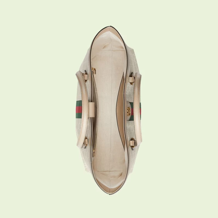 A heritage material from the archive, GG Supreme has been reimagined in Gucci Love Parade in different color combinations and combined with contemporary as well as classic styles. The Ophidia tote is presented in a beige and white variation of the signature material with a tonal trim. Originally a play on a '30s design, the canvas speaks to the historical narrative that runs throughout the collection.