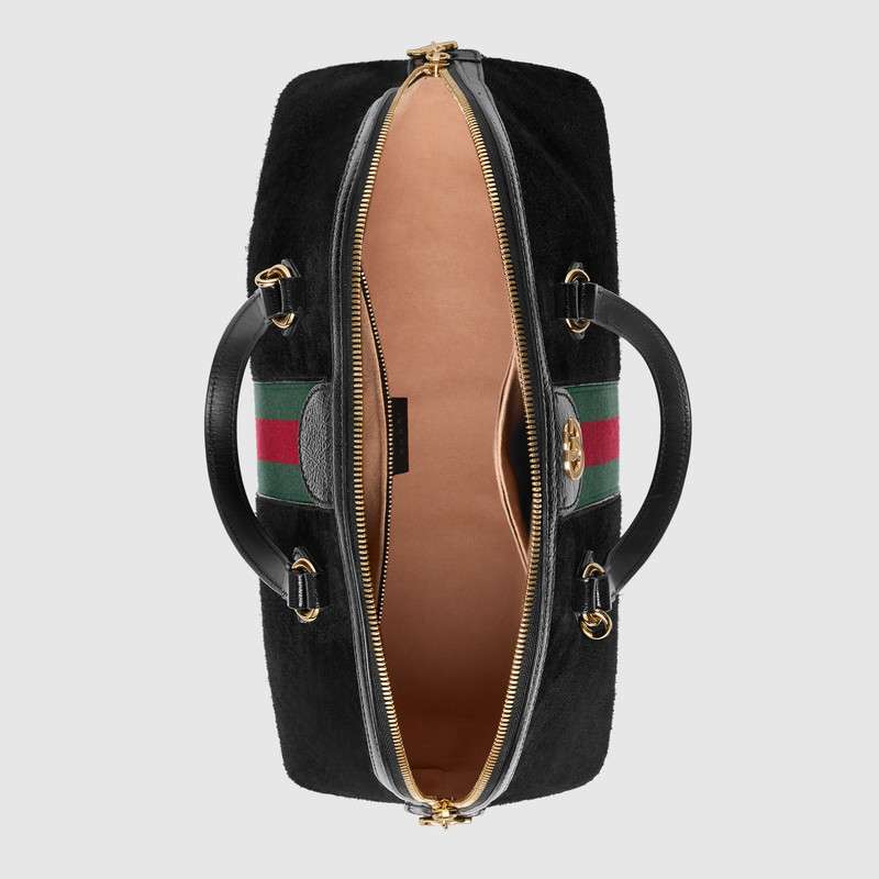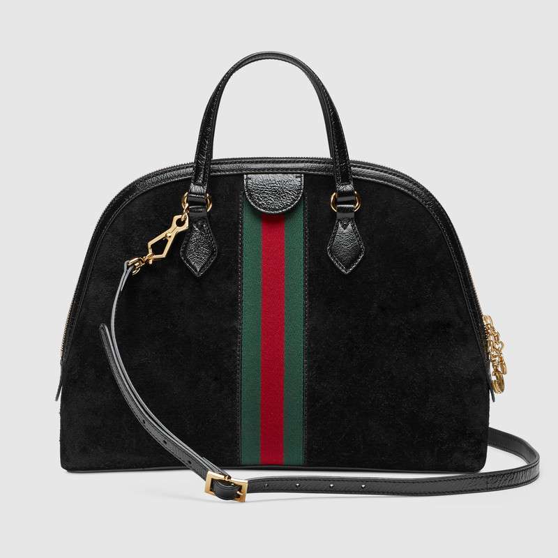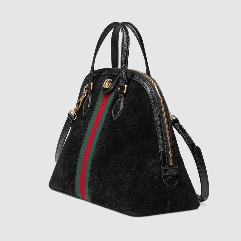 The world of Ophidia evolves with the introduction of this medium top handle bag crafted in black suede, contrasted by the historical green and red Web stripe. Defined by a domed shape that recalls vintage designs, the accessory is enhanced by a sophisticated play on the Double G, an archival Gucci code from the '70s that appears atop a patent leather tab detail and on the zipper pull. The bag is completed with a detachable shoulder strap which allows it to be carried in multiple ways.