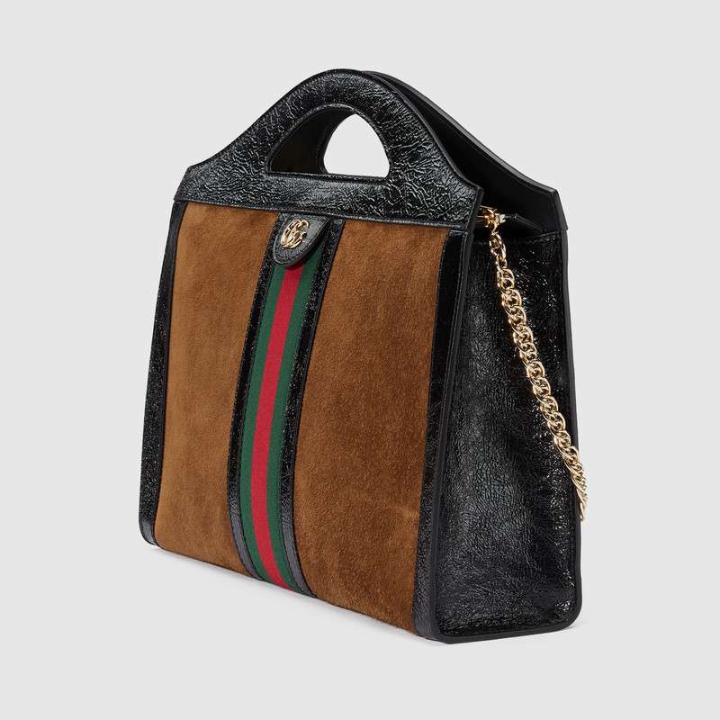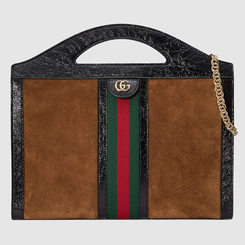 The Spring Summer 2018 collection delves into a nostalgic realm rich with vintage designs, details and references. Additions to the Ophidia collection introduce new shapes, including the top handle tote with a structured silhouette in softened suede trimmed with crackled effect leather.