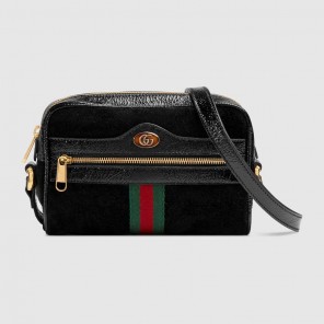 The world of Ophidia evolves with the introduction of a mini bag shape. Made in soft suede trimmed with crackled patent leather and the Web stripe, the design can be worn using an adjustable shoulder strap or attached to a separate bag with the attached key ring.