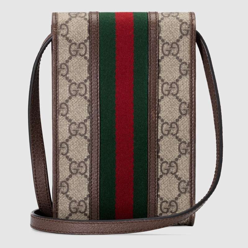 A new mini bag shape is presented within the Ophidia collection, with a magnetic flap closure and removable snap button shoulder strap. First developed by Gucci in the 1950s, the Web stripe continues to pay homage to the House's roots and equestrian influences, inspired by the strap that secured the saddle to the horse. Portrayed in its most notable combination of green and red, the stripe runs down the centre of the petite, rectangular shape in GG Supreme canvas. The style can be used as a phone bag.