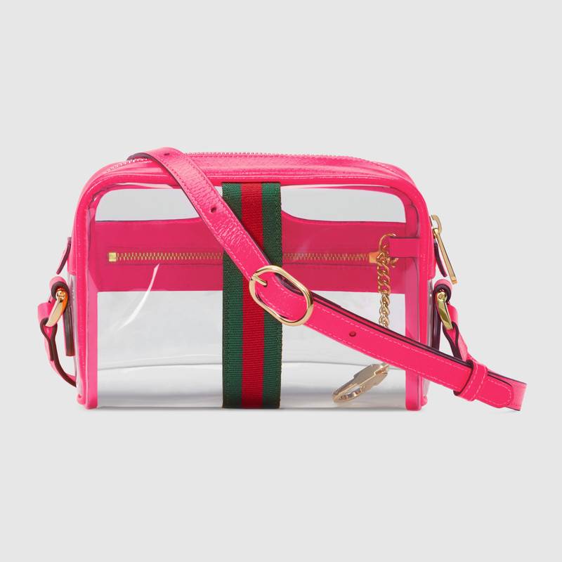 Presented on the Cruise 2019 runway, the Ophidia mini bag is introduced in transparent vinyl. The petite shape is trimmed with textured leather and finished with the green and red Web stripe.