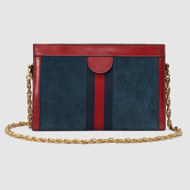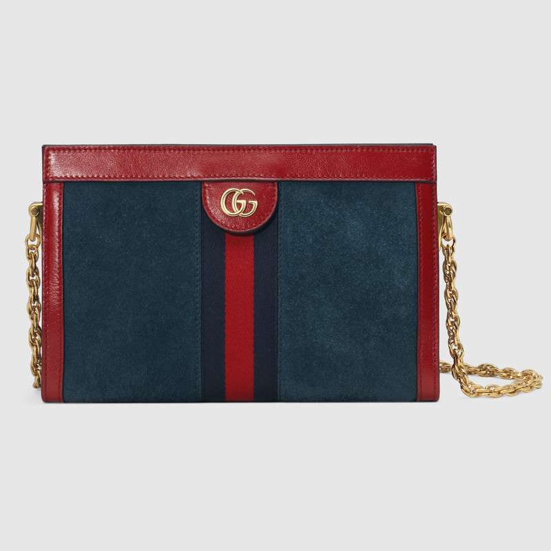 Crafted in blue suede with inlaid blue and red Web stripe, the vintage-inspired Ophidia chain strap shoulder bag is refashioned in a new chromatic combination that plays with emblematic colors of the House. The structured shape secures with a magnetic closure, trimmed with red leather and Double G hardware鈥攁 contemporary take on a Gucci archival belt buckle from the '70s.