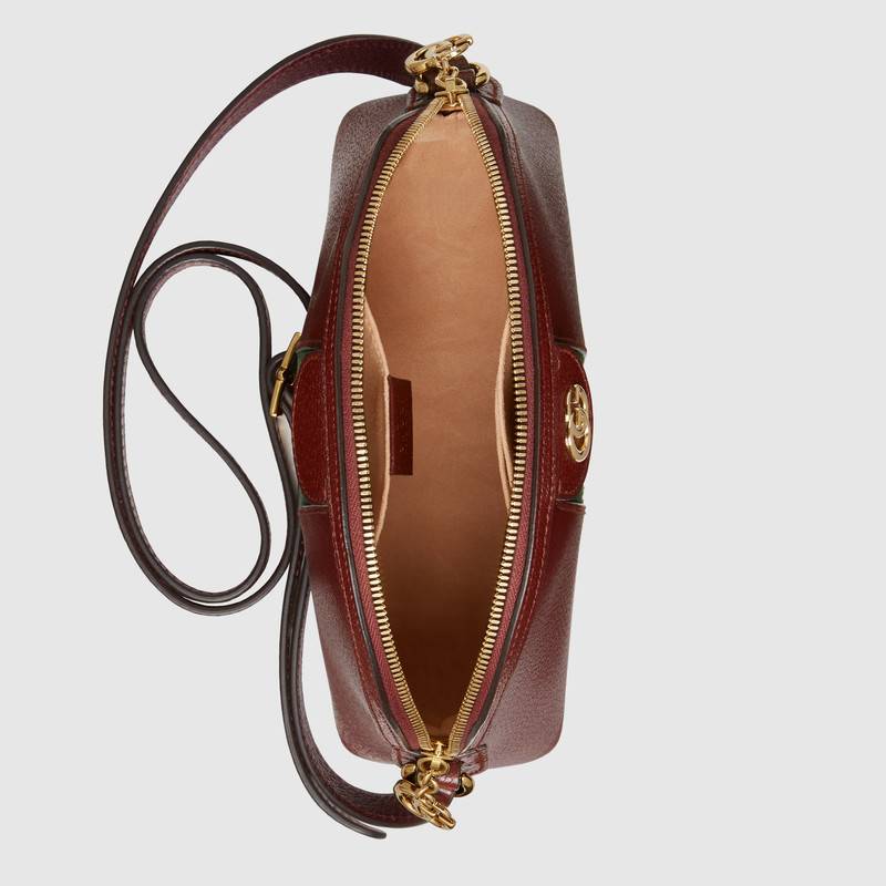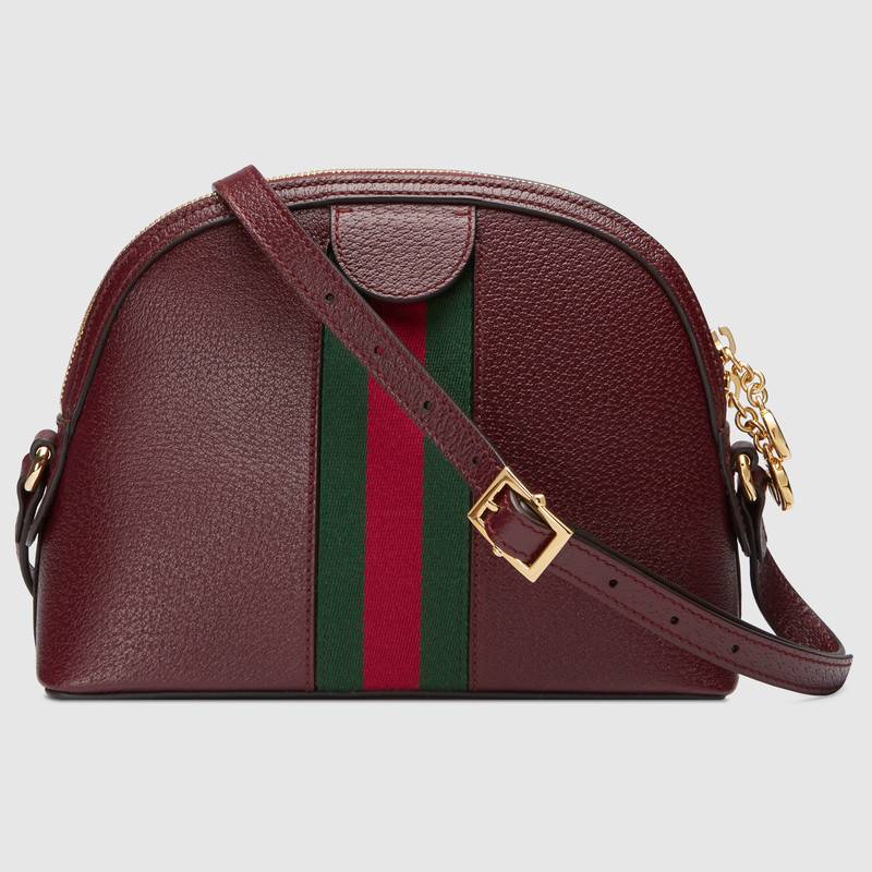 The rounded top Ophidia shoulder bag is introduced in a new iteration for Pre-Fall 2019, crafted from textured burgundy leather with inlaid green and red Web stripe. The coveted style is defined by small Double G details at the front tab and zipper pulls鈥攁 contemporary take on a Gucci archival belt buckle from the '70s, repurposed into a precious petite variation.