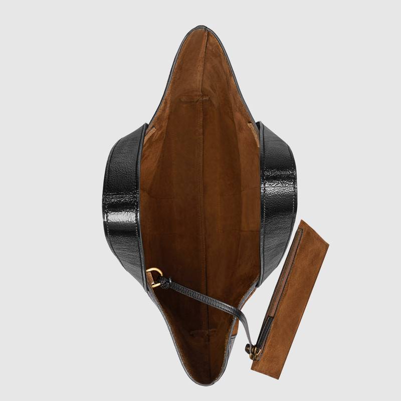 First developed by Gucci in the 1950s, the Web stripe continues to pay homage to the House's roots and equestrian influences, inspired by the strap that secured the saddle to the horse. Portrayed in its most notable combination of green and red, the stripe runs down the center of a large, unlined tote. The softened suede, crackled leather and archival House codes lend to the retooled vintage appeal that ties into the nostalgic undertones of the Spring Summer 2018 collection.