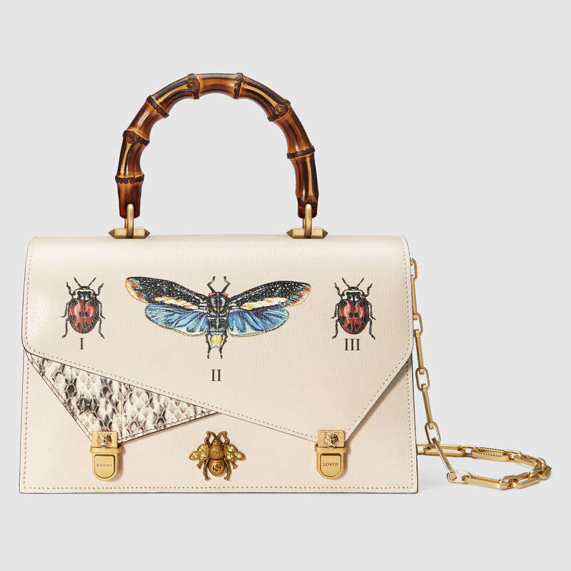 Animals thrive in the Alchemist's Garden-a magical wellspring of signs and symbols that influence the Fall Winter 2017 collection. Metal cicadas, bees, lion heads and the moth-all motifs connected to the House-appear on the structured top handle bag, juxtaposed with the iconic bamboo handle. The compartmentalized construction has a double flap closure. Each flap-one in contrast snakeskin-secures with a clasp closure.