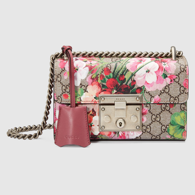 A small structured blooms print GG supreme canvas bag with our key lock closure. The sliding chain strap can be worn multiple ways, changing between a shoulder and a top handle bag.