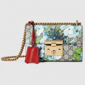 A small structured GG Supreme bag with a key lock closure pulled from the archives, the key is placed in a leather key case that loops around the chain. The sliding chain strap can be worn multiple ways, changing between a shoulder and a top handle bag. The GG Blooms print was first presented throughout the Fall/Winter 2015 Fashion Show collection and has continued to evolve as an iconic Gucci print.
