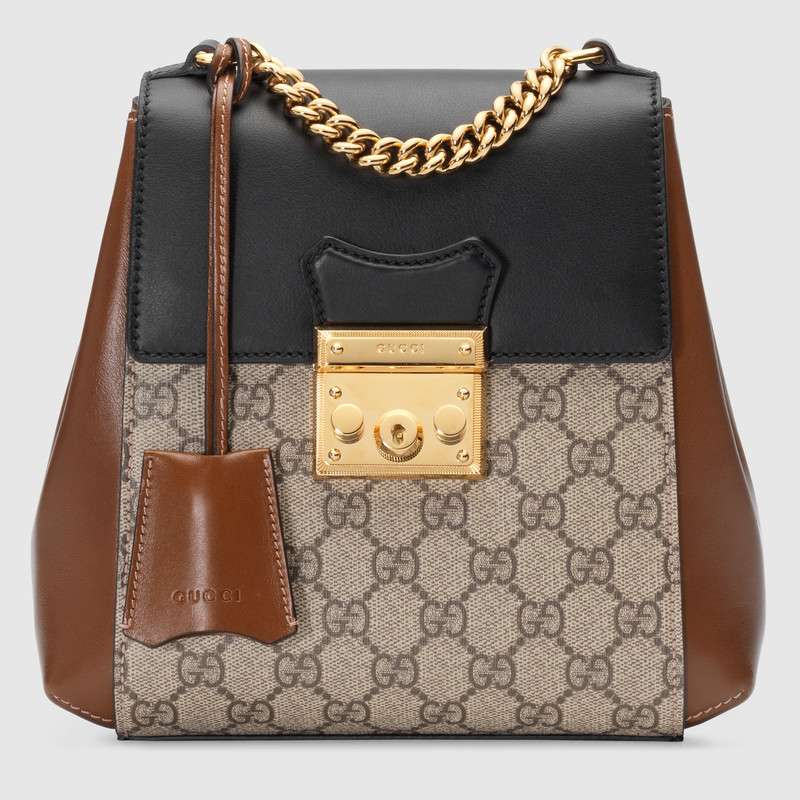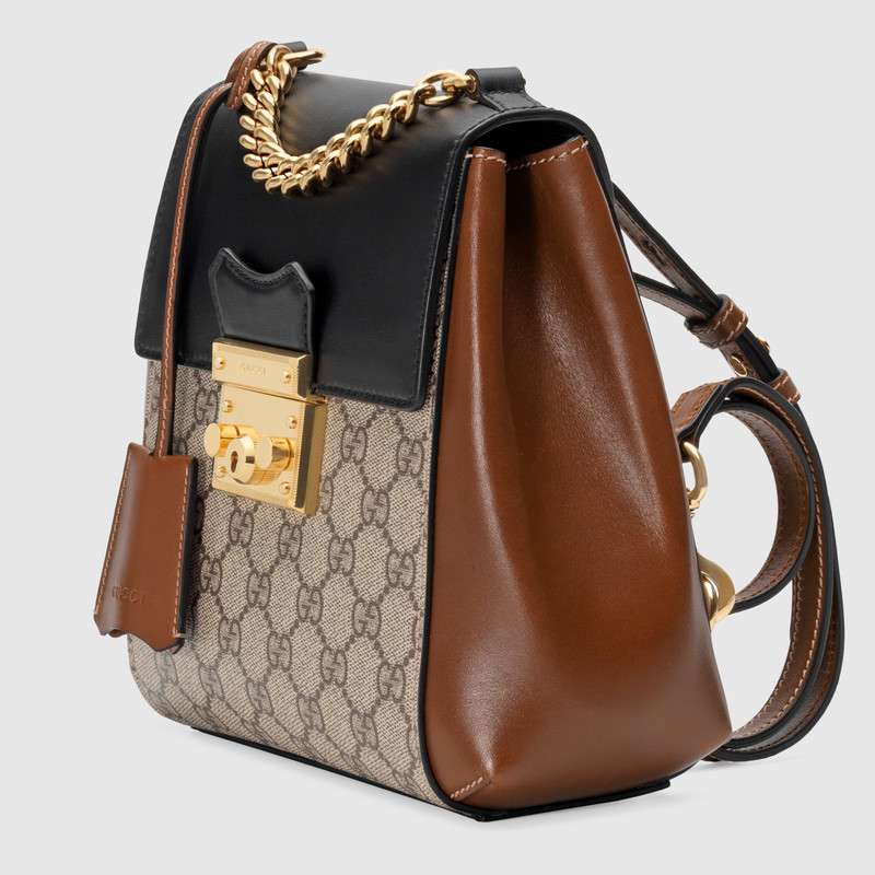 The structured backpack features defining details from the Padlock collection, in GG Supreme canvas with black and brown leather trims. The chain top handle is distinctive to the line, along with the key lock closure pulled straight from the archives. The key is placed in a detachable leather key case.
