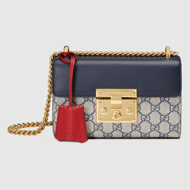 A small structured GG Supreme bag with a key lock closure pulled from the archives, the key is placed in a leather key case that loops around the chain. The sliding chain strap can be worn multiple ways, changing between a shoulder and a top handle bag.