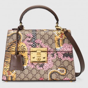 A small structured top handle bag with a key lock closure pulled straight from the archives, the key is placed in a leather key case. The shoulder strap is attached to the top handle for a simpler look that echoes a briefcase. Made in GG Supreme canvas with Gucci Bengal print, introduced for Cruise 2017. The print depicts tigers scattered amongst a colorful forest represented through brushstroke-style graphics to create a three-dimensional effect against the GG motif.