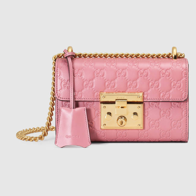 A small structured Gucci Signature leather bag with a key lock closure pulled from the archives, the key is placed in a leather key case that loops around the chain. The sliding chain strap can be worn multiple ways, changing between a shoulder and a top handle bag. Made in our heat embossed Gucci Signature leather resulting in a defined print with a firm texture.