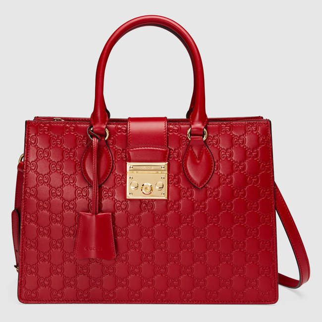 A new shape from the Padlock collection, this small size top handle bag has our key lock closure pulled straight from the archives, the key is placed in a leather key case that loops around handle. Made in our embossed Gucci Signature leather.