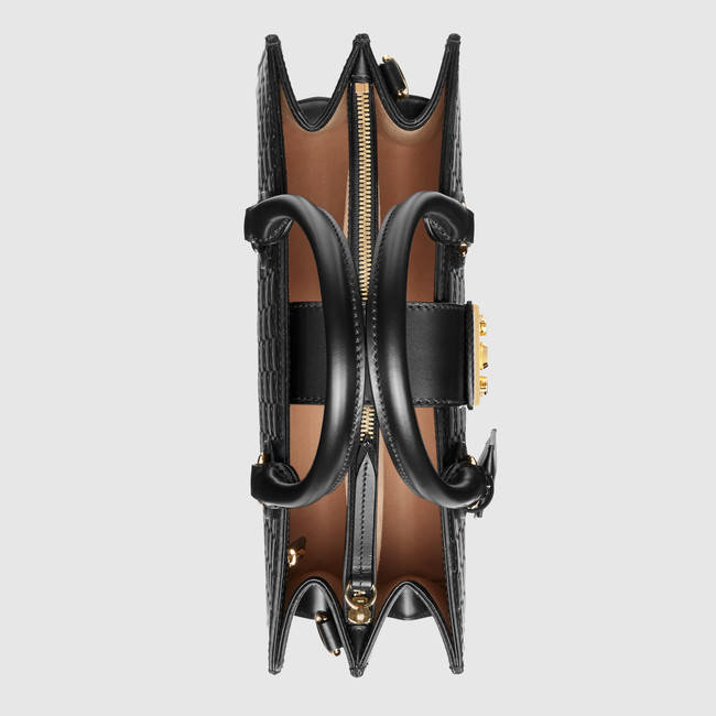 A new shape from the Padlock collection, this small size top handle bag has our key lock closure pulled straight from the archives, the key is placed in a leather key case that loops around handle. Made in our embossed Gucci Signature leather.